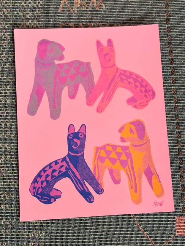 4 color riso print on 8.5” x 11” pink heavy weight paper