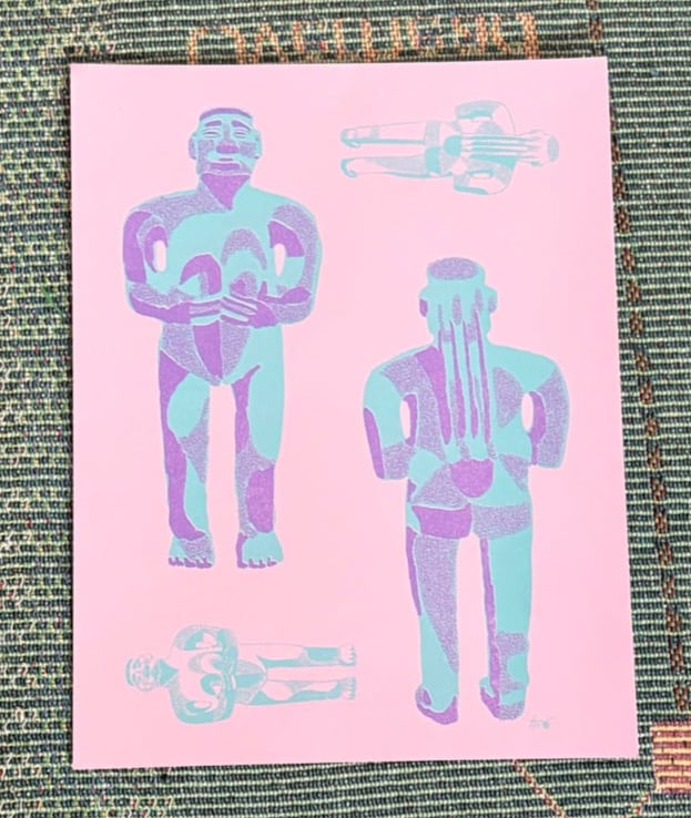 2 color riso print on 8.5” x 11” orchid heavy weight paper